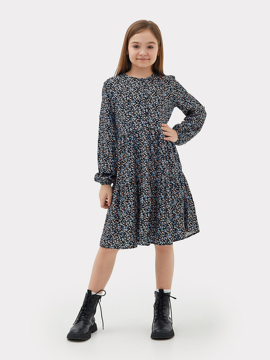 Платье А-силуэта с отрезными воланами. По переду застежка - планка на 4 пуговицы. Горловина круглая обработана бейкой в чистый край. Рукав длинный втачной. По низу рукавов внутрь застрочена эластичная тесьма.