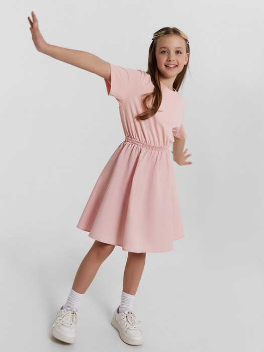 Платье  для девочек полуприлегающего силуэта. Верх платья из трикотажного кулирного полотна .Горловина круглая окантована обтачкой из рибаны. Рукав, втачной короткий.