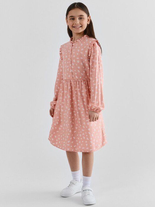 Платье прямого с отрезной юбкой по талии . По переду застежка - планка на 4 пуговицы. Горловина круглая обработана бейкой в чистый край, с рюшей. Рукав длинный втачной, с «крылышками» по пройме . По низу рукавов внутрь застрочена эластичная тесьма 10RV. Низ в подгибку.