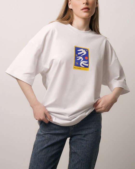 Футболка свободного силуэта. Спущенное плечо. Горловина из двух деталей, из рибаны.