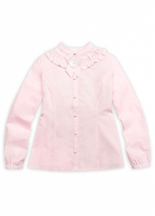 Блузка для девочек. Классическая блузка с длинным рукавом на узкой манжете. Воротник-стойка и декоративная сборка с рюшей в воротниковой зоне. Съёмный элемент в виде шикарной розочки из органзы на ленточке из основной ткани, крепится на пуговицу на планке. Коллекция - школа.
