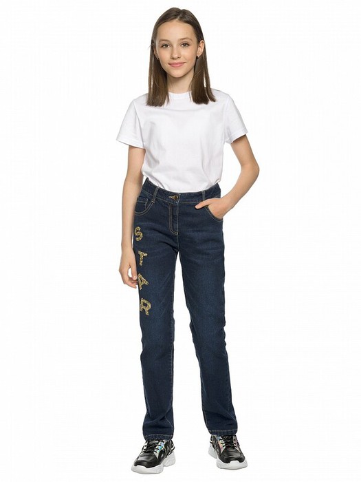 Прямые джинсы для девочек с начёсом из эластичного денима, слим силуэт, металлическая фурнитура, пояс с регулировкой ширины эластичным шнуром. Правая половина декорирована сверкающей аппликацией из страз. Перевод надписи Звезда.