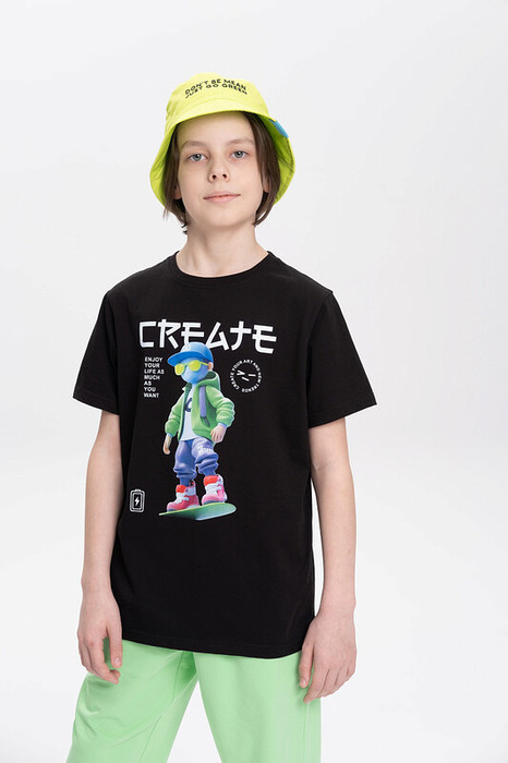 Футболка для мальчика прямого кроя - это идеальный выбор для активного ребенка. Вырез горловины обработан эластичной тканью — она прекрасно держит форму, не растягивается, при этом ребёнку удобно надевать и снимать футболку. Изделие неприхотливо в уходе. Футболка летняя с принтом по переду и надписями в японском стиле. Перевод надписей: "create" - создавай, "enjoy your life as much as you want" - наслаждайся жизнью столько, сколько хочется. Яркая спортивная футболка подходит как для подростков так и для малышей в детский сад. Подходит для любого времени года.