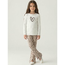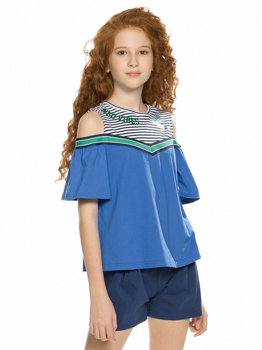 Комплект для девочек футболка и шорты. Футболка свободного объема с открытыми плечами и рукавами воланами. По всей линии груди проходит декоративная трикотажная лента, которая спереди формирует угол. Принт в виде птички колибри и надписи с разноцветным глиттером, перевод Новая атмосфера . Шорты свободного силуэта с защипами спереди и регулировкой объема шнуром.