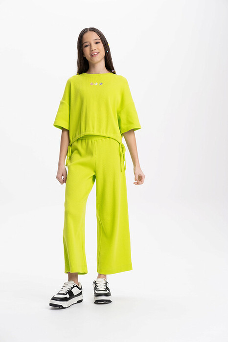 Комплект для девочки (кроп-топ и кюлоты), в котором собраны все самые актуальные тренды. Кроп-топ оверсайз-силуэта с сильно спущенным плечом дополнен утяжками по низу, с помощью которых можно регулировать объём и менять силуэт изделия. Брюки на широкой резинке с внутренней регулировкой объема шнуром. Благодаря особенностям кроя костюм долго будет "расти" вместе с ребенком. Комплект выполнен из трикотажного полотна с модной "вафельной" текстурой. В составе ткани преобладает хлопок, поэтому модель комфортная, приятная на ощупь, в ней не будет жарко летом. Эластан в составе ткани помогает изделию сохранять форму. Ткань проста в уходе. Изюминка топа — лаконичная вышивка в виде трёх цветков. Комплект идеально сядет на девочку любой фигуры, можно покупать без примерки. Костюм для настоящих модниц, в нем каждая девочка будет выглядеть стильно и эффектно.
