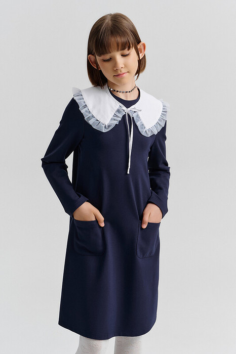 Платье выполнено из мягкого хлопкового трикотажа с добавлением полиэстера: оно дышит, держит форму, не мнётся и легко стирается — что особенно важно для школьной формы.