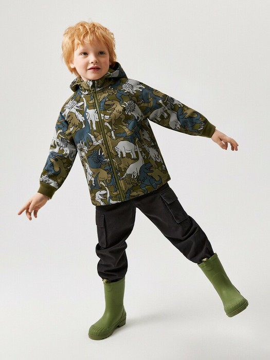 Детская куртка выполнена из ткани с водоотталкивающей пропиткой, которая  надежно оберегает от капризов погоды. Модель в цвете хаки с принтом динозавров по всему изделию придает образу индивидуальность. Подкладка покрыта флисом, что обеспечивает дополнительный комфорт. Утеплитель отсутствует. Рекомендованный температурный режим от +5 до +20 градусов. Манжеты выполнены из трикотажного полотна, которое обеспечивает лучшее прилегание к телу и сохраняет тепло. Центральная бортовая застежка на молнию предотвращает задувание холодного воздуха. Рукава реглан обеспечивают комфортную посадку на любую ширину плеч. Карманы с листочкой добавляют практичности. Капюшон надежно защищает непогоды. Модель представлена в двух цветах: хаки для мальчиков и светло-розовом для девочек. Стилизуйте куртку с брюками и толстовкой, чтобы создать комфортный образ для прогулок на свежем воздухе. Рост модели на фото 113. Размер модели на фото 110.