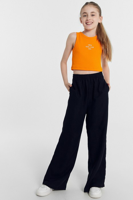 Брюки для девочек широкие. Посадка высокая. Пояс цельнокроеный из основного полотна, застрочен с эластичной тесьмой RV40 внутри, по поясу проложены отделочные строчки. В боковых швах обработаны карманы. Низ брюк обработан швом в подгибку.