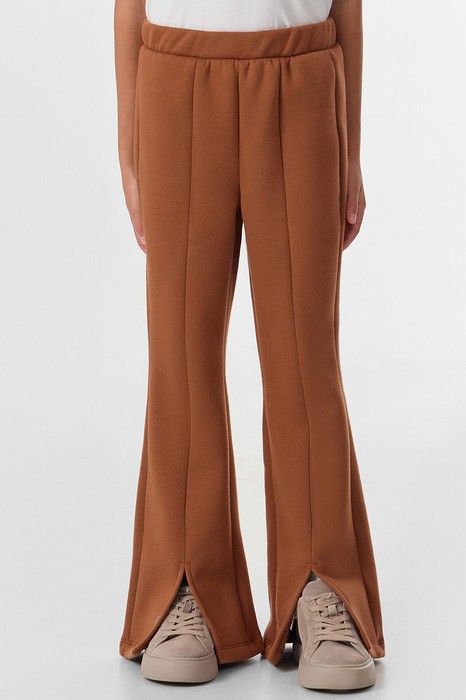 Брюки со середней посадкой. Пояс отрезной с внутренней эластичной тесьмой 30RV. Брюки расклешенный к низу. По центру передней части брюк расположен шов, по низу изделия разрезы.