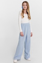 Брюки свободного силуэта. Посадка средняя. Пояс отрезной с эластичной тесьмой внутри. В боковых швах обработаны карманы. По низу брюк вытачки.