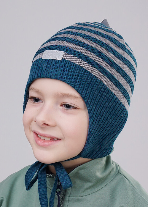 Детская шапка с удлиненными ушами на завязках, декорирована светоотражающей нашивкой в центральной части и светоотражающей "петлёй" в верхней части изделия. Внутри хлопковый подклад (95% хлопок, 5 % эластан), а в области ушей дополнительное утепление- ветрозащитная мембрана.