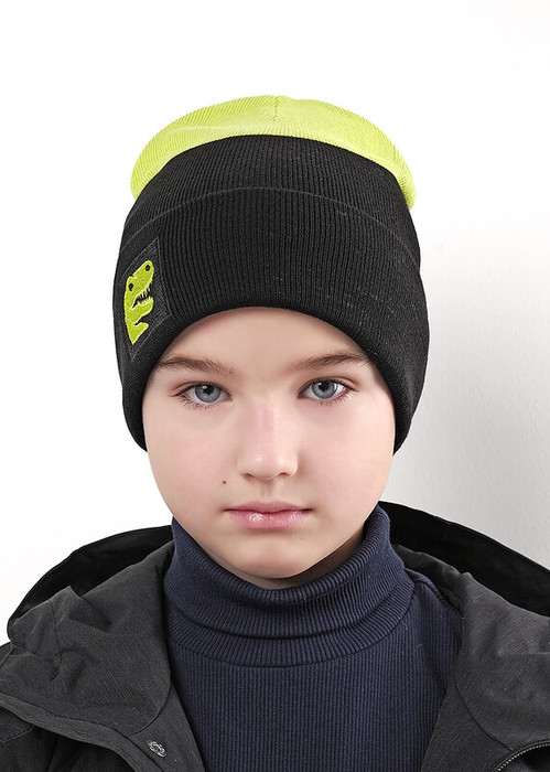 Стильная детская двойная шапка связана гладью. На отвороте декорирована стильной вышивкой - динозавр.Изготовленная из хлопка с добавлением акрила, благодаря чему не покрывается катышками и не теряет форму. Идеальный вариант на осень, весну. Размер 54-56