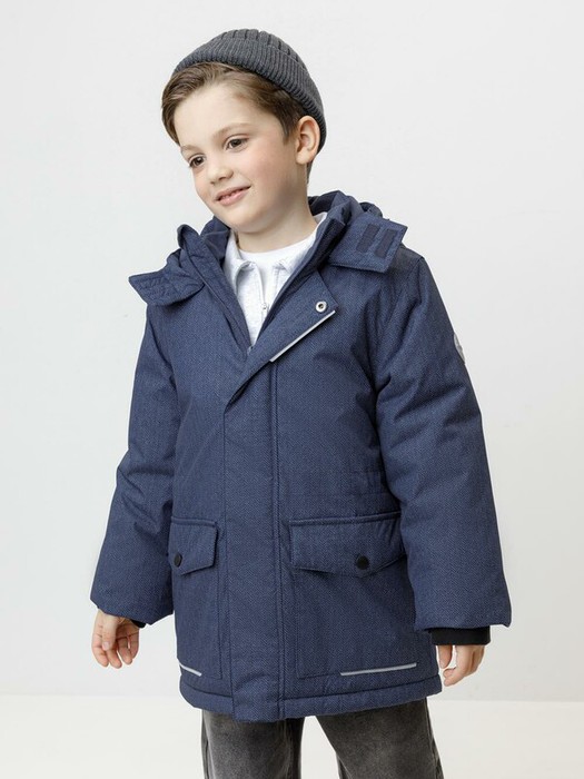 Зимняя куртка для мальчика с утеплителем  SEE®: 300 г/м2. Выполнена из мембранной ткани с дополнительной тефлоновой обработкой, которая предохраняет изделие от загрязнений и отталкивает влагу. Подклад выполнен из 100% полиэстера Tricot. Куртка застёгивается на молнию и внешнюю планку с магнитными кнопками, предусмотрена защита подбородка. Съёмный капюшон на кнопках и липучках имеет эластичную утяжку со стопперами. На рукавах внутренние эластичные манжеты. Два накладных кармана с клапанами по бокам. По талии эластичная утяжка со стопперами. Во всех изделиях верхнего ассортимента для безопасности ребёнка предусмотрены светоотражающие элементы.