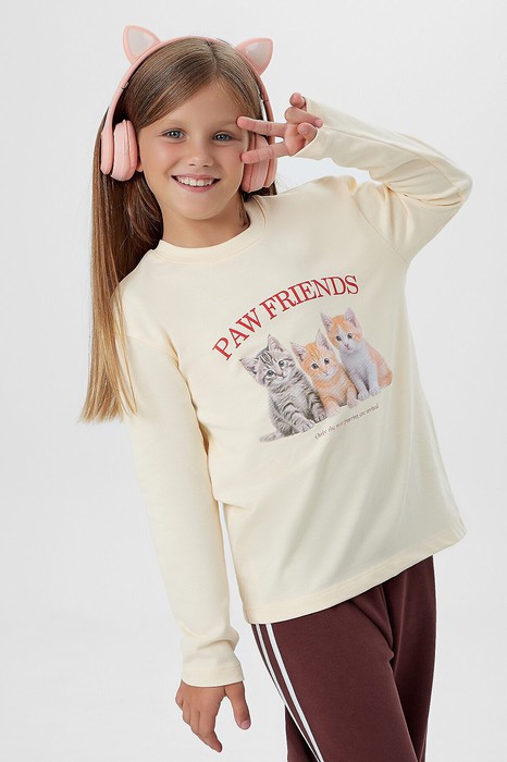 Лонгслив для девочек, прямого силуэта. Горловина округлой формы, из рибаны. Шов втачивания рибаны закрыт бейкой из основного полотна. Плечо спущено, рукав втачной длинный. Низ изделия и рукавов обработан швом в подгибку на двухигольной плоскошовной машине.