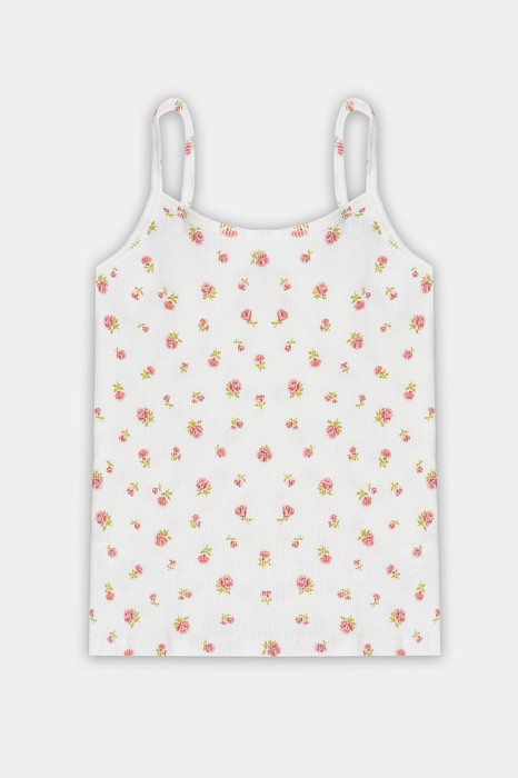 Топ прилигающего силуэта длиной чуть выше середины бедер. Верхний край спинки, бретели, срезы пройм окантовы бейкой. Перед и спинка цельнокроеные. Низ застрочен на 2-хигольной плоскошовной машине швом вподгибку с открытм срезом