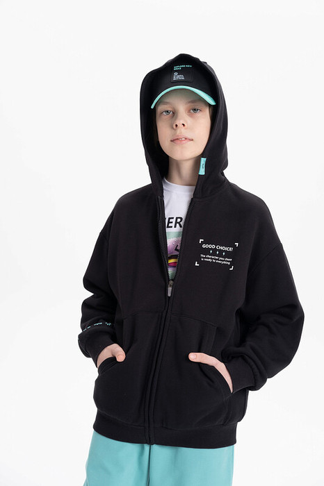 Трикотажный бомбер для мальчика. Модель выполнена из плотного футера-петля. Изделие прямого силуэта, объем оверсайз. Манжеты рукавов и низ толстовки выполнены и рибаны. По переду накладные карманы. На спине принт с надписью. Перевод надписи: "easy" - легко. Спереди высокий резиновый текстовый принт и нашивка. Перевод надписей "Good choice! The character you chose is ready to everything" - хороший выбор! Выбранный персонаж готов ко всему. Рукава тоже декорированы принтом с надписью "digital" - диджитал. На капюшоне предусмотрена регулировка объема утяжкой. Зипка застегивается на молнию. Кофта спортивная имеет широкий размерный ряд, который подойдет как малышам так и подросткам. Подходит для круглогодичного ношения весной, летом, осенью и зимой.