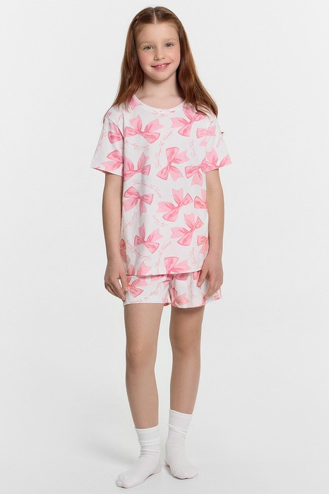 Пижама для девочек. Выполнена из трикотажной кулирки. Состоит из футболки и шортиков. Футболка свободная, с круглой горловиной, короткими рукавами. Шорты свободные, длиной до колен, пояс с эластичной тесьмой внутри. В такой пижамке сны будут действительно приятными!