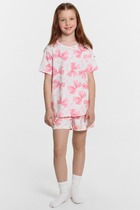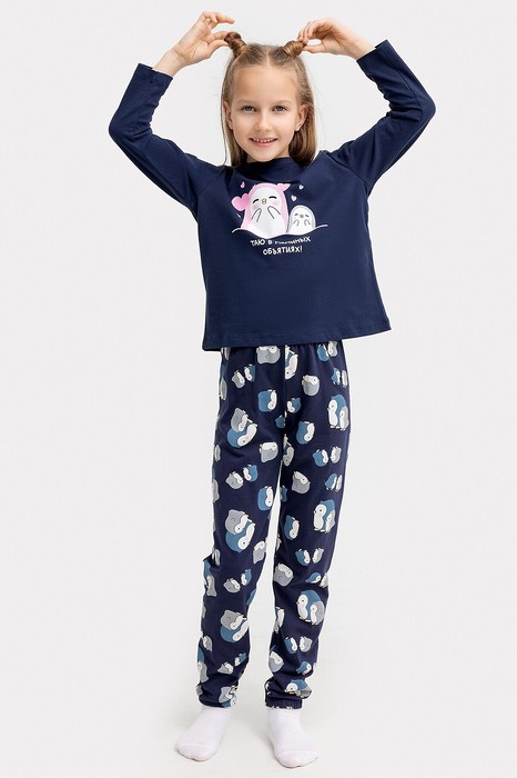 Комплект для девочек состоит из джемпера и брюк. Горловина круглой формы с притачной обтачкой из основного полотна. Рукава длинные втачные. Перед и спинка цельнокроеные. Низ джемпера и рукавов обработан швом в подгибку. Брюки длинные, немного заужены к низу. Пояс цельнокроенный с эластичной тесьмой внутри. Низ брюк застрочен с эластичной тесьмой внутри.