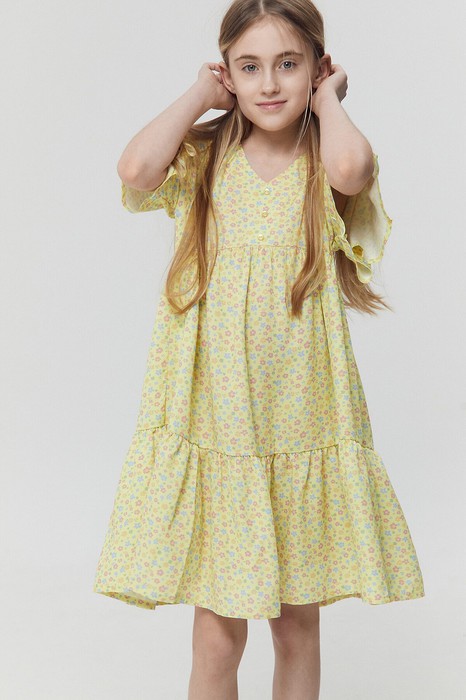 Легкое детское платье А-силуэта с отрезными воланами для девочек. Треугольный вырез горловины. Короткие рукава-крылышки покроя реглан. Низ лифа фигурный. По переду лифа пришиты три пуговицы в качестве декора. Материал очень приятный к телу, хорошо пропускает воздух, что позволяет чувствовать комфорт даже в жаркую погоду. Мягкое, слегка эластичное, комфортно сидит по фигуре, не стесняет движений. Представлено в широком размерном ряду и цветовой палитре. Модное и невероятно красивое. Подходит для девочек на каждый день в теплое время года. Рекомендуем!