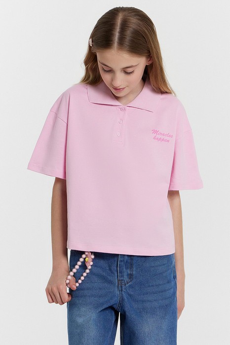 Модельные ососбенности: Поло для девочек свободного силуэта с воротником из довяза. На детали переда обработана планка с 3 пуговицами d=10mm, горловина круглой формы. Плечо спущено, пройма слегка углублена. Рукав втачной, короткий.