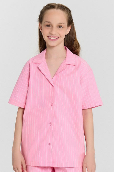 Блузка для девочек. свободного силуэта из ткани. По переду обработана застежка на пуговицы d=10mm и петли. Рукава короткие, втачные, слегка спущены. Нижние срезы изделия и рукавов обработаны швом в подгибку.