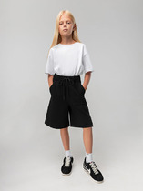 Шорты для девочек свободного силуэта из ткани. Посадка высокая. На детали переда карманы с отрезным бочком. Пояс отрезной с эластичной тесьмой RV40 внутри, на поясе пробиты петли и вставлен шнур из основного полотна. Шов втачивания пояса распошит. Длина выше колена. Низ обработан швом вподгибку с закрытым краем.