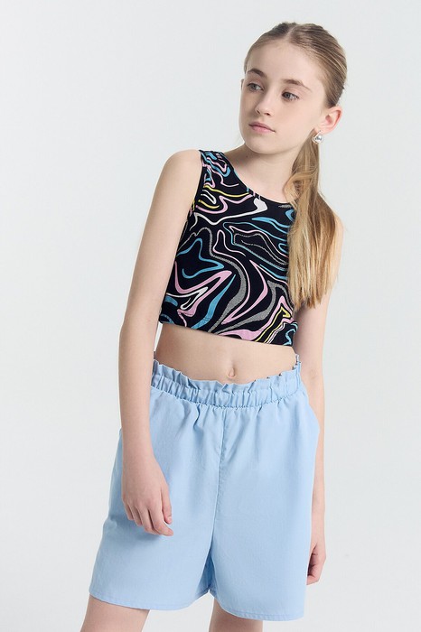 Шорты изготовлены из текстиля. Шорты свободные. Пояс отрезной, внутрь застрочена эластичная тесьма. В боковых швах передних частей шорт наклонные карманы. Низ изделия обработан на 2-х игольной плоскошовной машине швом в подгибку.