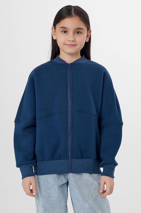 Толстовка свободного силуэта. Круглый вырез горловины. В горловину втачен воротник-стойка из рибаны. Рукава втачные, длинные. По низу рукава манжеты из рибаны. По переду застежка на молнию. По переду и спинки декоративные членения. По низу изделия отрезной пояс из рибаны.