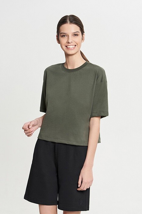 Укороченная футболка CROP, спущенное плечо. Горловина из рибаны. Укрепление по шву горловины спинки и плечевым швам бейкой из основной ткани.