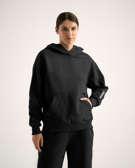 Худи свободного кроя с капюшоном, спущенное плечо, карман кенгуру.
