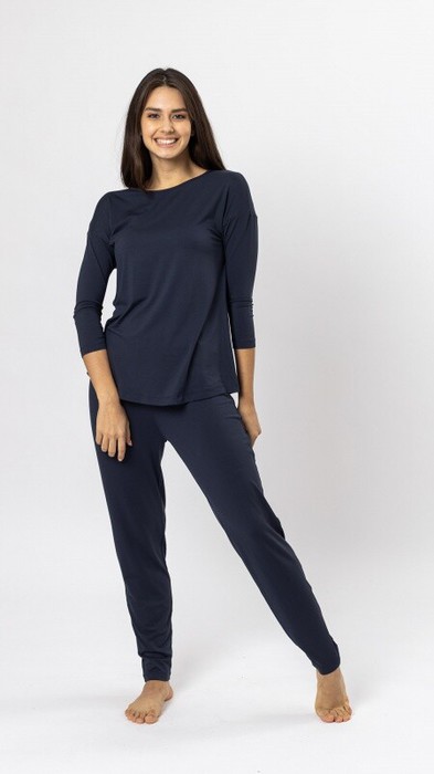 Лонгслив свободного кроя с фигурным низом, рукав три четверти. Узкие брюки прямого силуэта, отстроченный пояс
