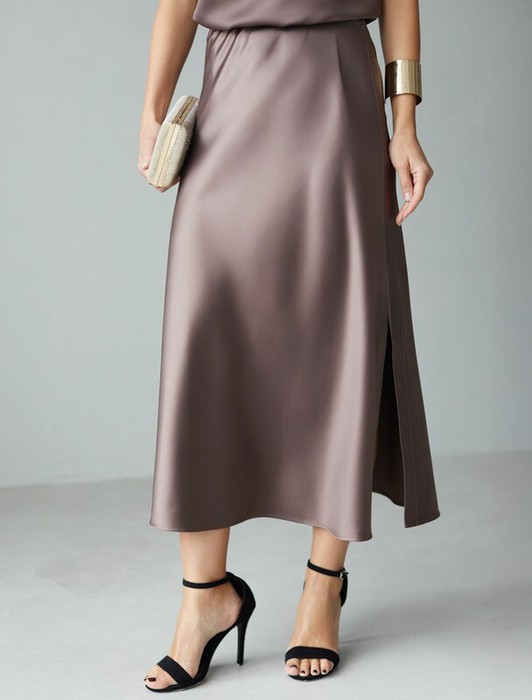 21.04 Vilatte Юбка миди с разрезом из струящегося плотного сатина D26.205 кофейн