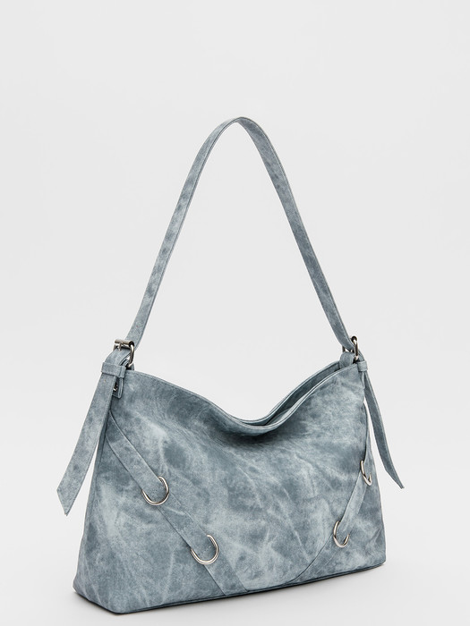 Элегантная форма хобо с декоративными ремнями и металлической фурнитурой представлена в голубом оттенке. Сочетание винилискожи с отделкой под деним и эффектом тай-дай делает модель стильным акцентом в любом образе.