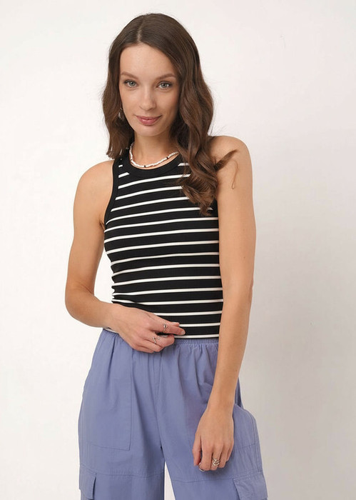 Майка из трикотажного полотна кашкорсе в рубчик. Умеренный объем. Широкая бретель,округлая горловина. По пройме и горловине окантовка.