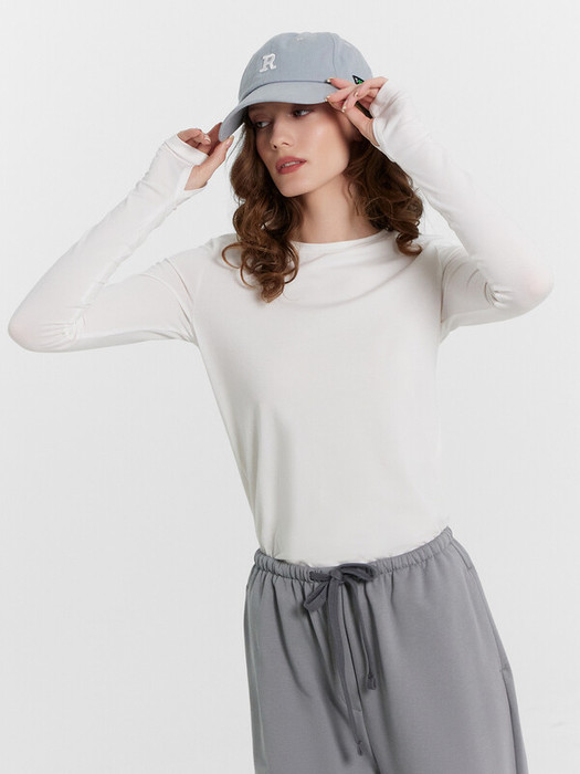 Горловина круглой формы, с обтачкой из основного полотна. Шов горловины спикни окантован бейкой из оснвоного оплотна. Рукав втачной длинный, по низу в шве обработан разрез для пальца. Джемпер удлинен.