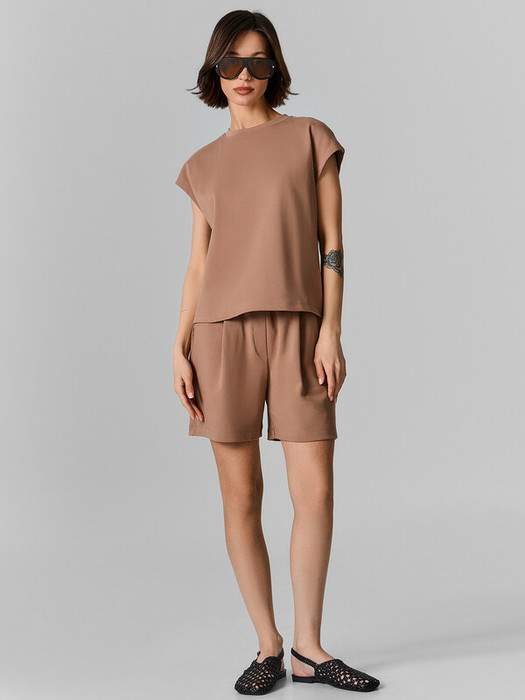 Шорты свободного силуэта, выше колена. По переду заложены складки. По бокам карманы с отрезным бочком. Пояс отрезной, с внутренней резиной 40RV и круглым шнуром 8мм с метал. эглетами (8NMKXWC-1). Низ изделия вподгибку.