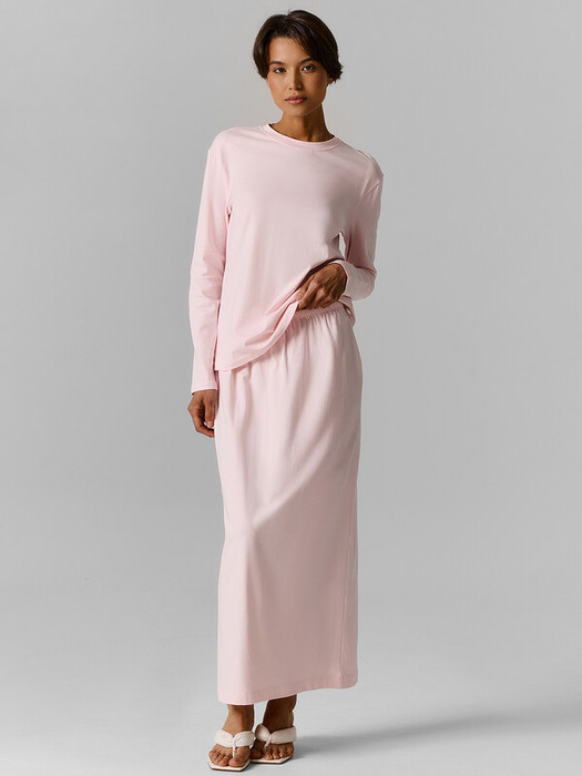 Комплект состоит из лонгслива (122952) и юбки (152809) из кулирного полотна. Лонгслив прямого силуэта. Горловина круглая, обработана обтачкой из основного полотна. Рукава втачные длинные, плечо спущено. Нижний срез изделия и рукавов обработан швом вподгибку.