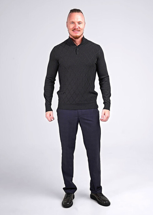 Мужской джемпер с воротником стойка на пуговицах, с длинным рукавом. Модель связана из приятной хлопковой пряжи с добавлением акрила с вывязанным геометрическим рисунком по полочке. Изделие можно сочетать как в классическом стиле, так и в повседневном.
