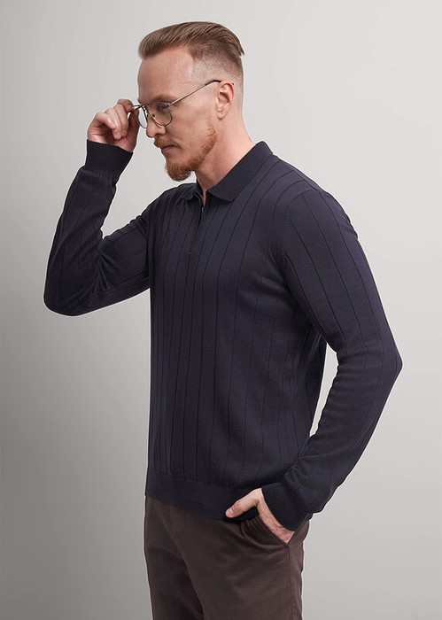 Мужская вязаная рубашка -поло на разборе с молнией и длинным рукавом. Модель связана из приятной хлопковой пряжи с добавлением акрила. Изделие можно сочетать как в классическом стиле, так и в повседневном.