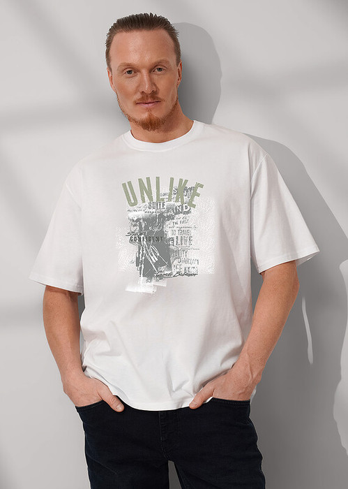 Футболка мужская, увеличенного объема, из хлопкового полотна, круглым вырезом горловины и втачным рукавом. Оригинальность изделию придает дизайнерский принт. Отличный вариант на каждый день.