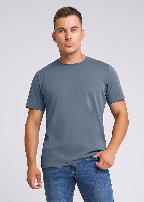 Базовая однотонная футболка стандартного объема с круглой горловиной, втачным рукавом из хлопкового полотна с добавлением эластана. Является неотъемлемой частью мужского гардероба.
