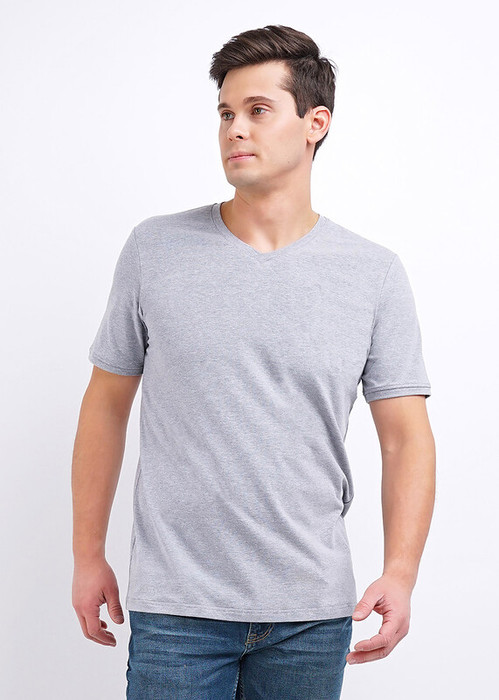 Базовая однотонная футболка стандартного объема с V вырезом горловины, втачным рукавом из хлопкового полотна с добавлением эластана. Является неотъемлемой частью мужского гардероба.