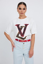 Футболка прямого силуэта из хлопкового трикотажного полотна. Округлая горловина с обтачкой из рибаны. Короткий рукав со спущенной линией плеча. На детали переда принт.