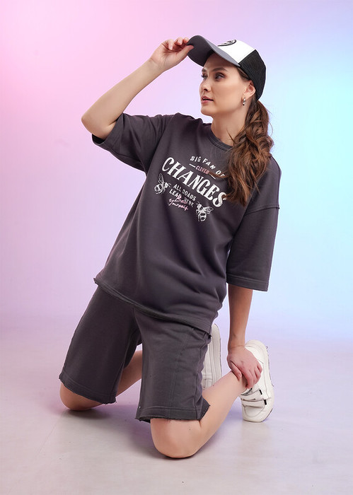 Футболка свободного кроя из трикотажного полотна футер. Короткий спущенный рукав. Округлая горловина с окантовкой из рибаны. Спереди принт. По спинке средний шов с открытым срезом, нашивка принт. По пройме, низу изделия открытый срез.