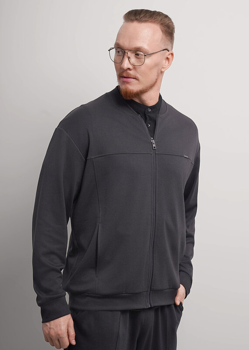 Мужской бомбер на молнии из жаккардового трикотажного полотна. Дизайн модели дополнен имиджевой фурнитурой. Стильное решение для похода на учебу или работу.