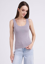 Майка из хлопкового трикотажного полотна рибана. Умеренный объем. Широкая бретель, округлая горловина. По горловине и пройме окантовка.