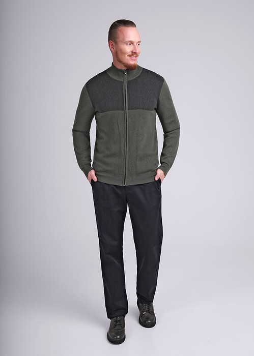 Жакет мужской на молнии с длинным рукавом и воротником стойкой. Модель дополнена рельефной вязкой на полочке. Данное изделие комфортно и практично в носке, прекрасно сохраняет тепло. Можно скомбинировать с брюками или джинсами.