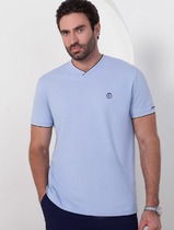 Фуфайка мужская из однотонного трикотажного полотна с коротким рукавом. Горловина круглая обработана обтачкой. Низ рукава обработан манжетами. Обтачка и манжеты изделия из контрастного отделочного полотна.