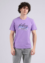 Фуфайка с коротким рукавом среднего объема, с оригинальным принтом, круглым вырезом горловины, которая оформлена обтачкой из рибаны.
