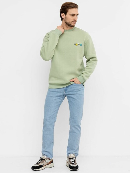 Теплый мужской свитшот из трикотажного футера с нежным подчесом. Силуэт прямой, вырез классический – круглый, не глубокий. Рукава длинные, на манжетах из рибаны. Спущенная линия плеча дарит свободу движений. Пояс, проходящий по нижнему срезу, также сделан из рибаны. Отличный свитшот для городских образов.